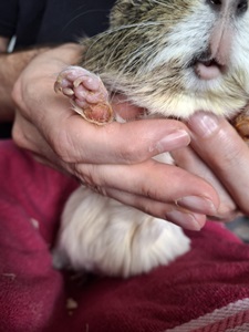 Vicky wird bereits seit dem Frühjahr gegen Ballenabszesse behandelt. Leider war die behandelnde Praxis nicht auf Heimtiere spezialisiert, sodass hier neben Salben und Verbänden nie hinterfragt wurde, WARUM sie sich denn weniger bewegt und dadurch Ballenabszesse bekommt. Nicht einmal Schmerzmittel gönnten sie dem Schweinchen.