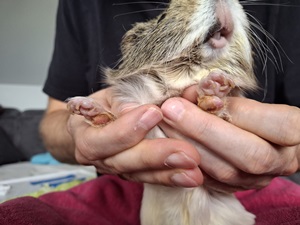 Die kleine Maus hat zumindest alle 4 Schneidezähne, sieht aber nur sehr wenig bis gar nichts. Sie zeigt sich bisher munter und frisst schon eifrig. Wie viel Zeit ihr aber bleibt, ist natürlich auch hier völlig ungewiss.