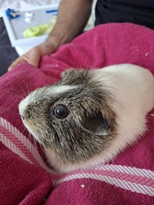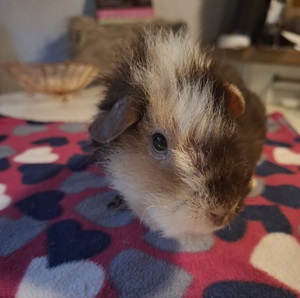 Ramon ist ein 3 jähriger aufgeschlossener Kastrat, der mit einem guten Kilo eher zu der kleineren Sorte gehört. Dennoch hat er gleich großes Interesse an seinen Mädels gezeigt und sich sehr um sie gekümmert. Die Vergesellschaftung verlief problemlos. Er hat gleich gezeigt wer der Mann im Haus ist. Er ist ein freundliches und zutrauliches Meerschweinchen. Ramon lässt sich auch vorsichtig an der Nase streicheln. Seine Beeinträchtigung sieht man ihm nicht an. Für die Gabe der Augentropfen lässt er sich leicht aus dem Gehege nehmen.